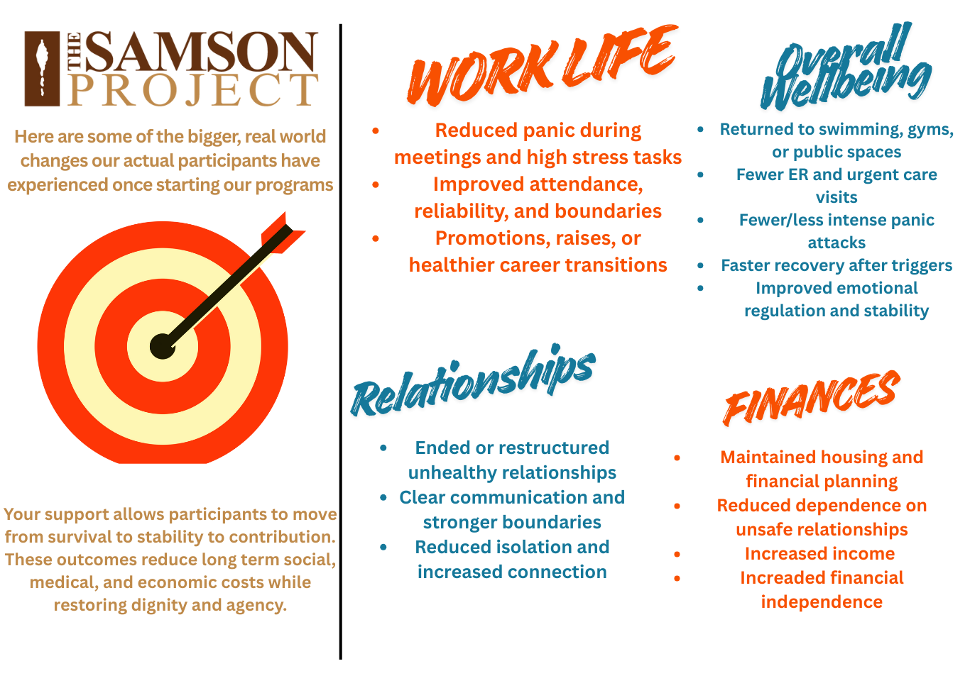 Absolutely love this program! I started this program to help me with my anxiety, I wasn’t sure what to expect and went into it skeptical. I have learned so much! Techniques to help me with my anxiety when the those feeling come creeping in are amazing. I have been taken out of my comfort zone and learned a lot about myself. I highly recommend this program. Much love for The Samson Project!!